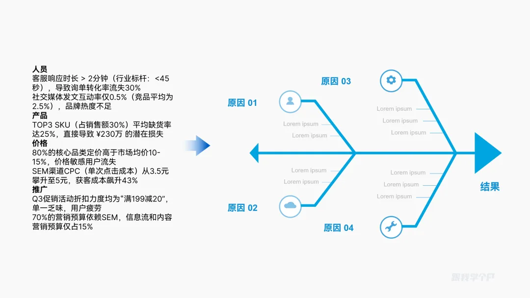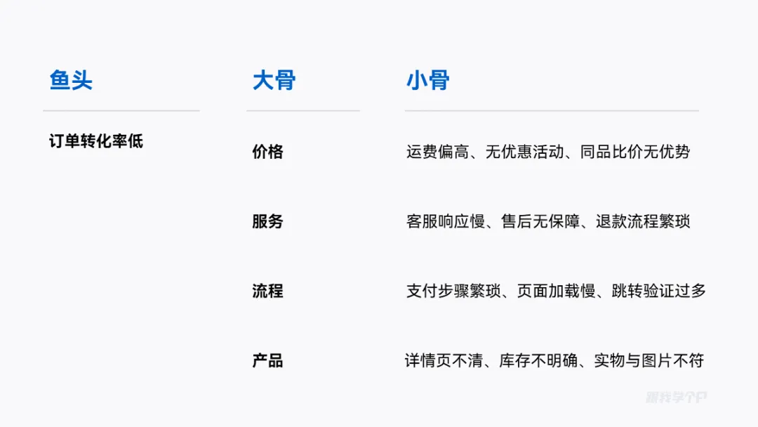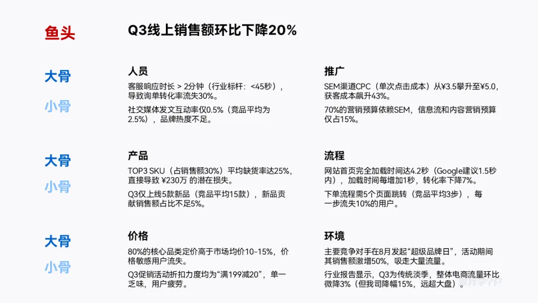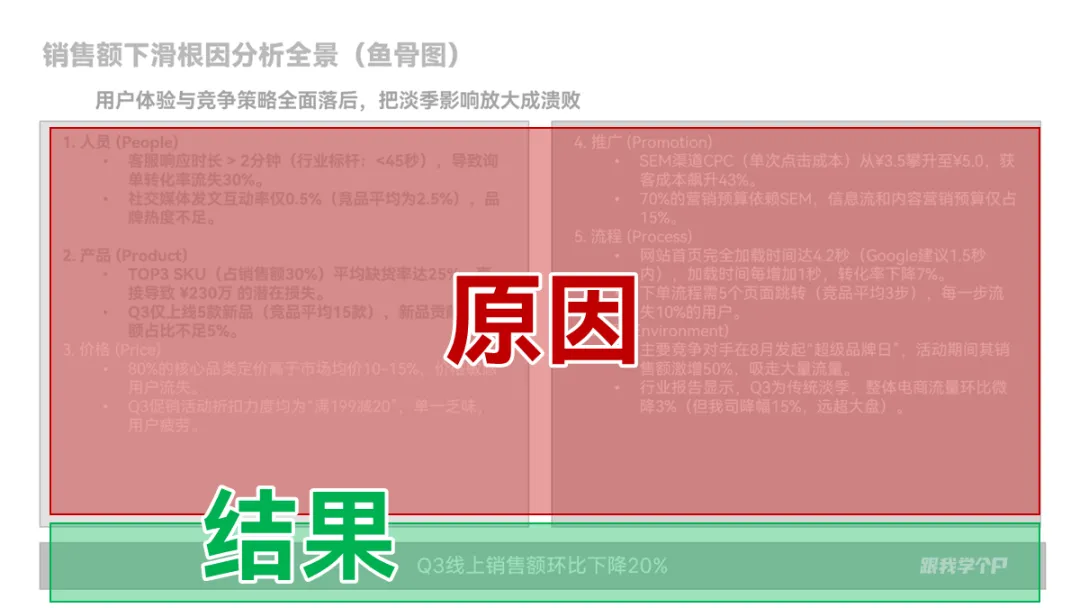 首先找出内容中的鱼头和鱼骨部分,也就是原因和结果: