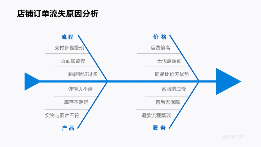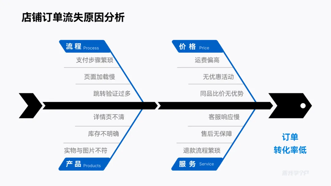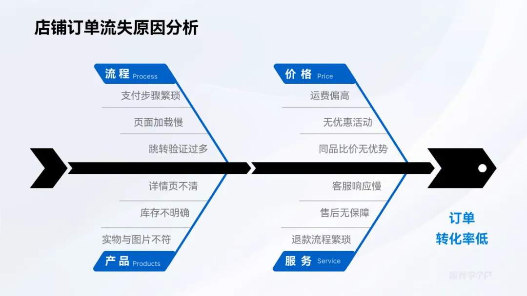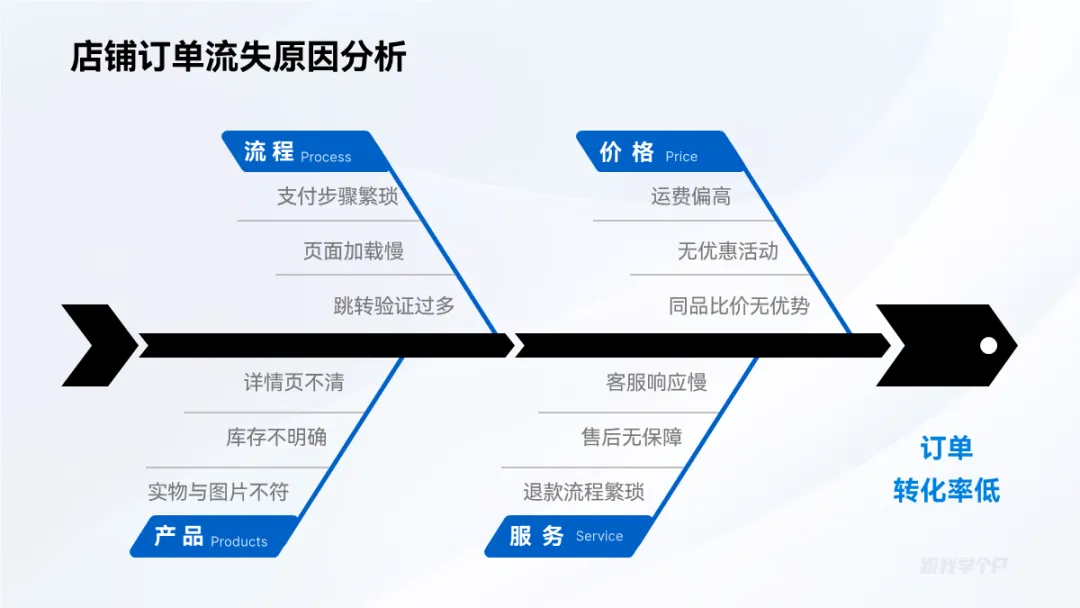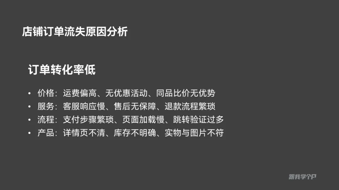 先来看一个简单的,这页是店铺订单流失原因分析的案例: