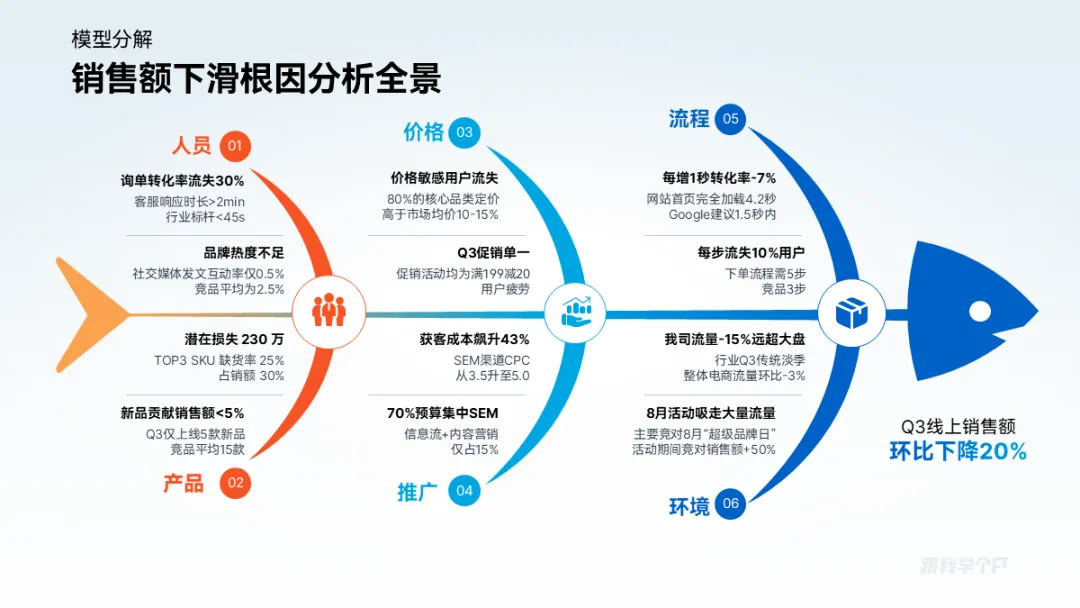 将内容对号入座,用颜色做好信息模块的区分,并将结论放在鱼头位置: