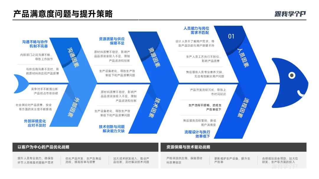 这种图表的核心作用是用“鱼骨”的形式,展示问题的各项原因,比如工作问题复盘、核心问题分析等场景。