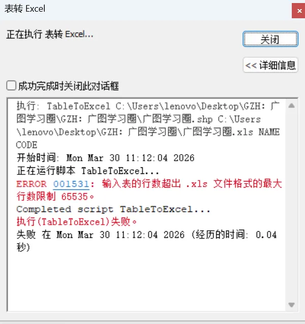 ArcGIS在使用表转Excel工具时是不是遇到这样的问题,输入表的行数超过了Excel(.xls)的行数限制,导致工具执行失败,如下图所示。