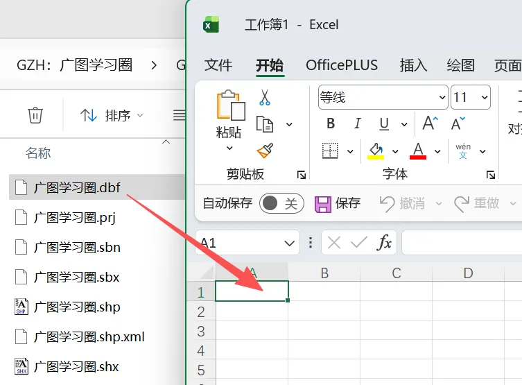C、将DBF属性表所在的文件夹窗口和新建的高版本Excel表格窗口调整至合适位置,再用鼠标将DBF属性表拖拽至新建的Excel表格中。