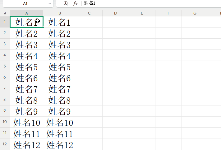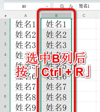 输入完成后,左键单击选中B列,同时按下「Ctrl + R」,即可将A列的姓名快速填充到B列。