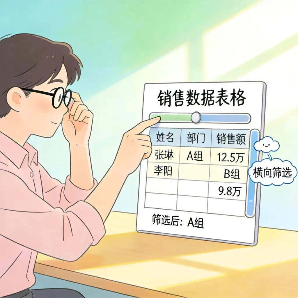先想象一下这样的场景:你有一份销售数据表格,其中列标题是不同的月份,行是各个销售人员。平时你可能会竖着看每个月的销售情况,但有时你可能想快速知道某个销售人员在哪些月份业绩突出或不佳,这时纵向筛选就不太方便了。而横向筛选就能轻松解决这个问题,它可以让你像筛选列数据一样,快速从行数据中找到满足条件的内容。