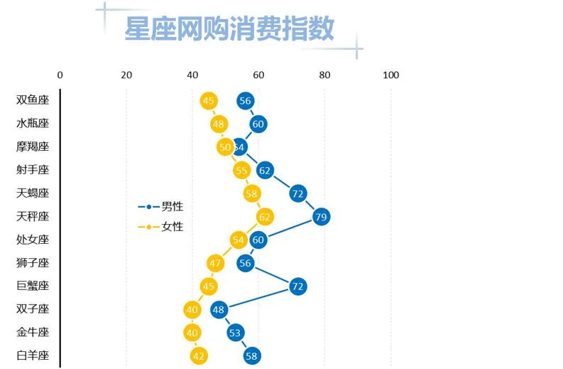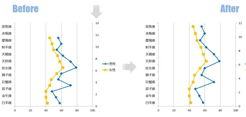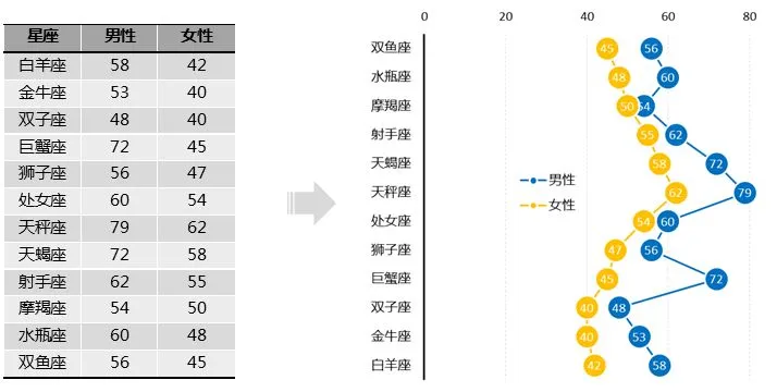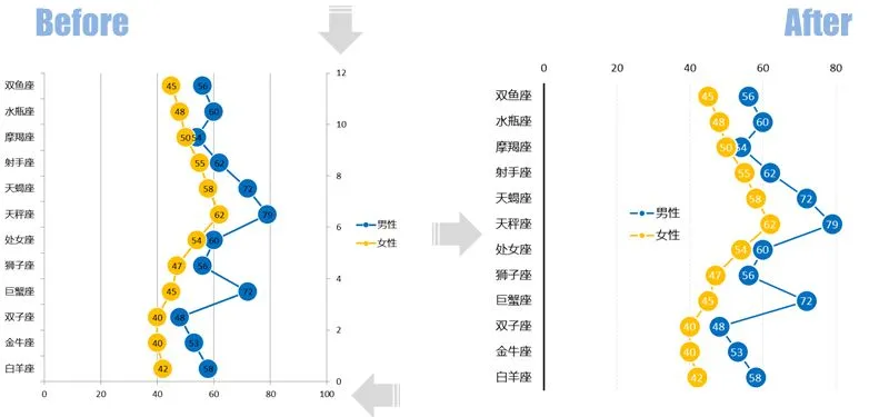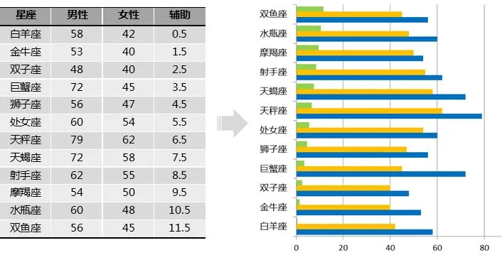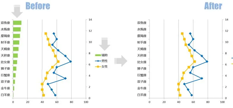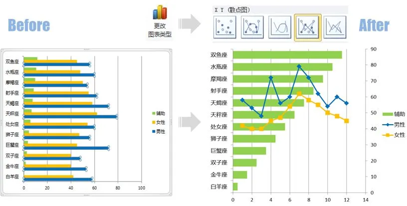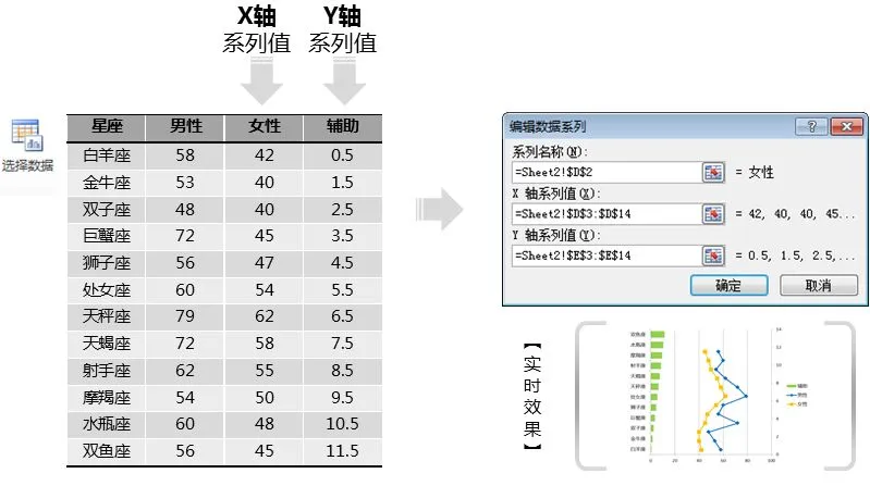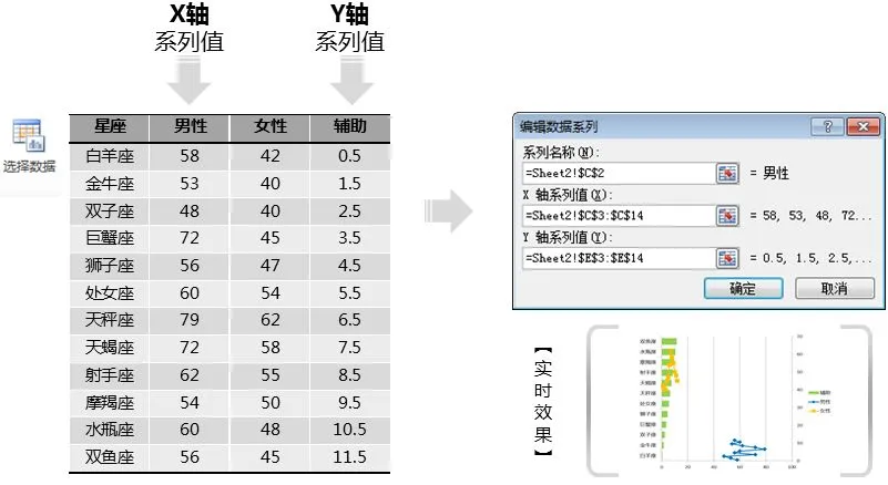 这个步骤的操作结果是形成一张组合图表,其中的【男性】和【女性】系列是散点图,而【辅助】系列则是最开始的条形图。