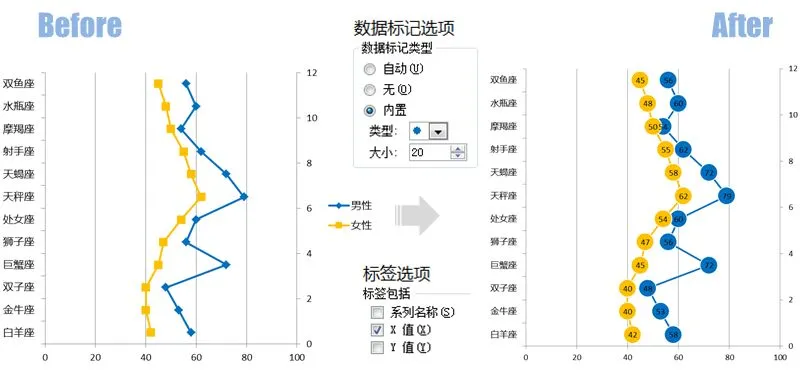 然后添加显示【数据标签】,通过【标签选项】,设置其显示的内容为“X值”,也就是【男性】和【女性】系列的具体数值。
