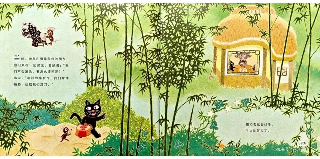 当时,老鼠和猫是很好的朋友,他们聚在一起讨论。老鼠说:“我们不会游泳,要怎么渡河呢?”猫说:“可以跟牛合作,我们帮他指路,他载我们渡河。”