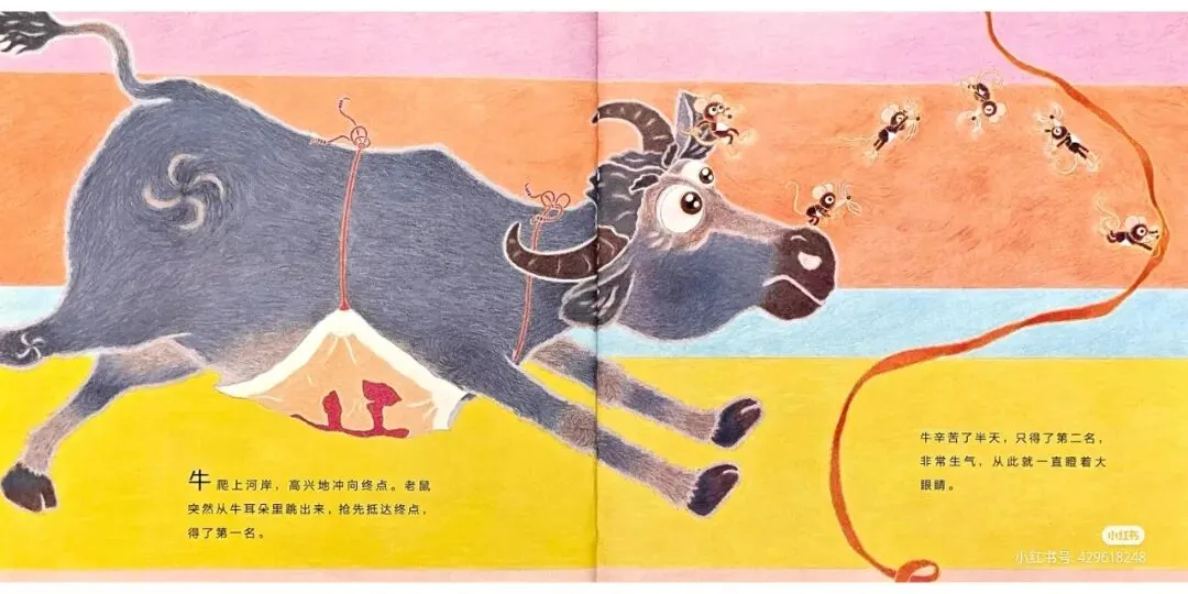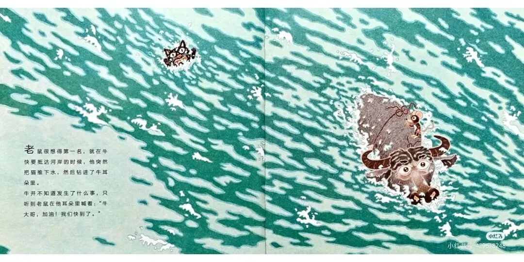 牛爬上河岸,高兴地冲向终点。老鼠突然从牛耳朵里跳出来,抢先抵达终点,得了一名。