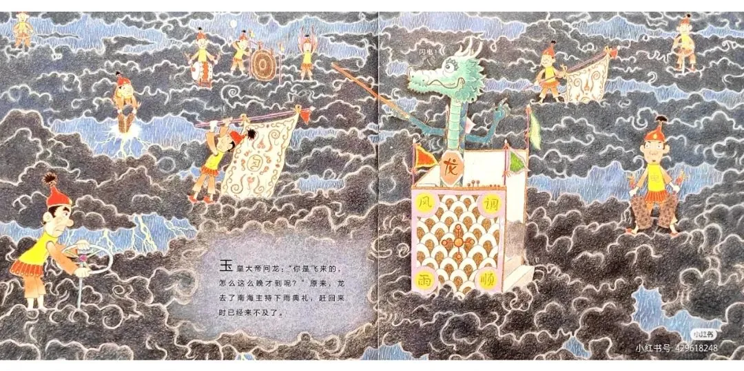 玉皇大帝问龙:“你是飞来的,怎么这么晚才到呢?”原来,龙去了南海主持下雨典礼,赶回来时已经来不及了。