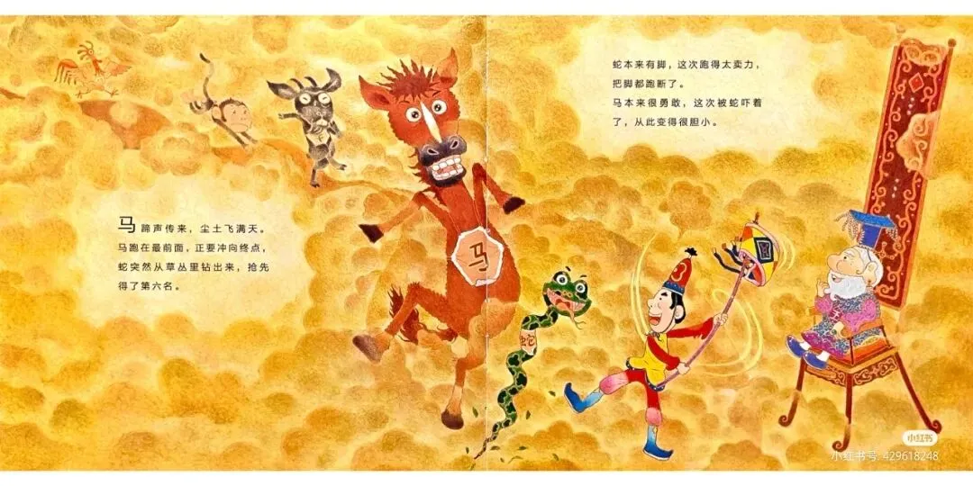 马蹄声传来,尘土飞满天,马跑在最前面,正要冲向终点,蛇突然从草丛里钻出来,抢先得了第六名。