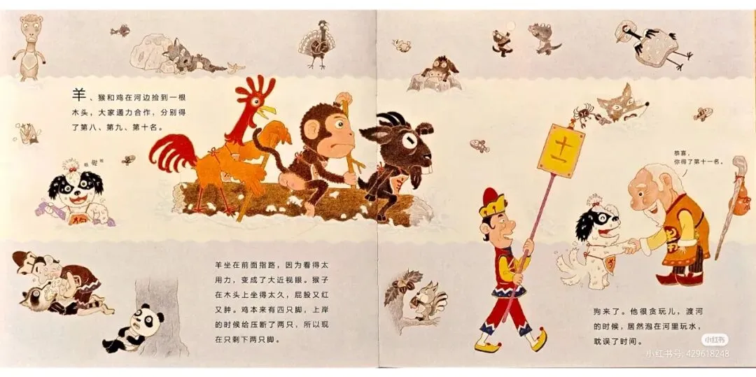 羊坐在前面指路,因为看得太用力,变成了大近视眼。猴子在木头上坐得太久,屁股又红又肿。鸡本来有四只脚,上岸的时候给压断了两只,所以现在只剩下两只脚。