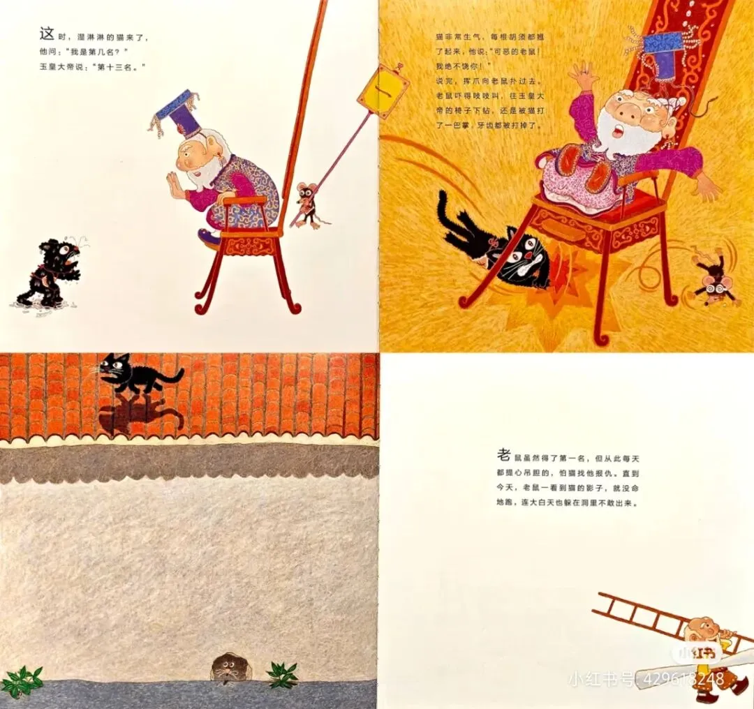 说完,挥爪向老鼠扑过去。老鼠吓得吱吱叫,往玉皇大帝的椅子下面钻,可还是被猫打了一巴掌,牙齿都被打掉了。