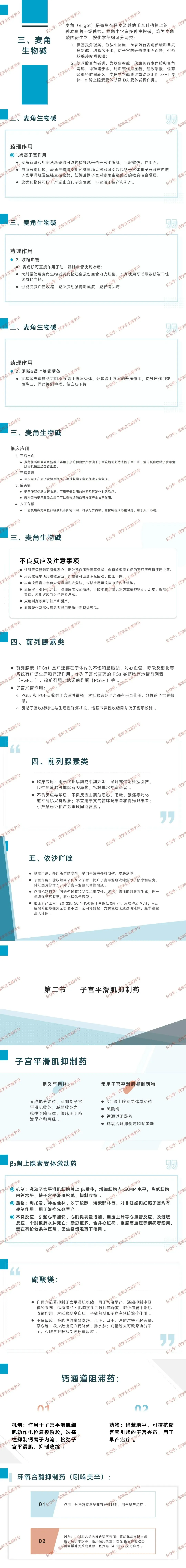 硫酸镁:显著抑制子宫平滑肌收缩,用于防治早产;还能抑制中枢神经系统等,对妊娠期高血压等有预防治疗作用。不良反应有潮热等,注射过快引起头晕等,极少数出现血钙降低等,剂量过大可致严重反应。