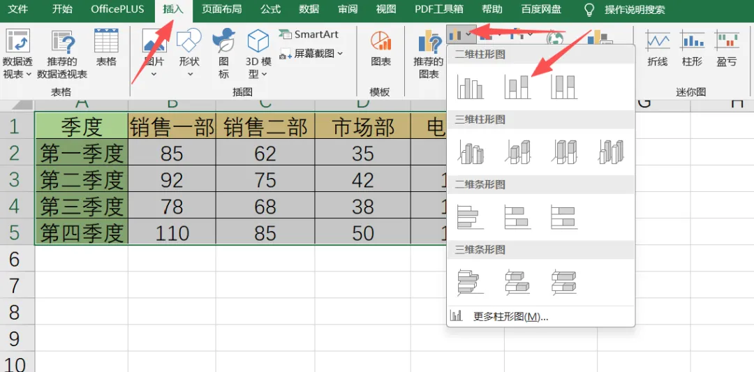 首先,选中数据,点击“插入”,选择二维柱形图中的“堆积柱形图”,即可生成图表。