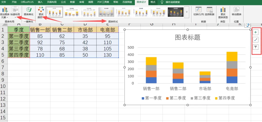 点击图表右侧的“+”号(即"图表元素"快捷按钮),可以快速添加或隐藏图表中的常见元素,如坐标轴、坐标轴标题、图表标题、数据标签、数据表、误差线、趋势线等。