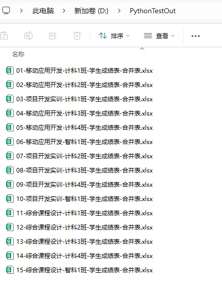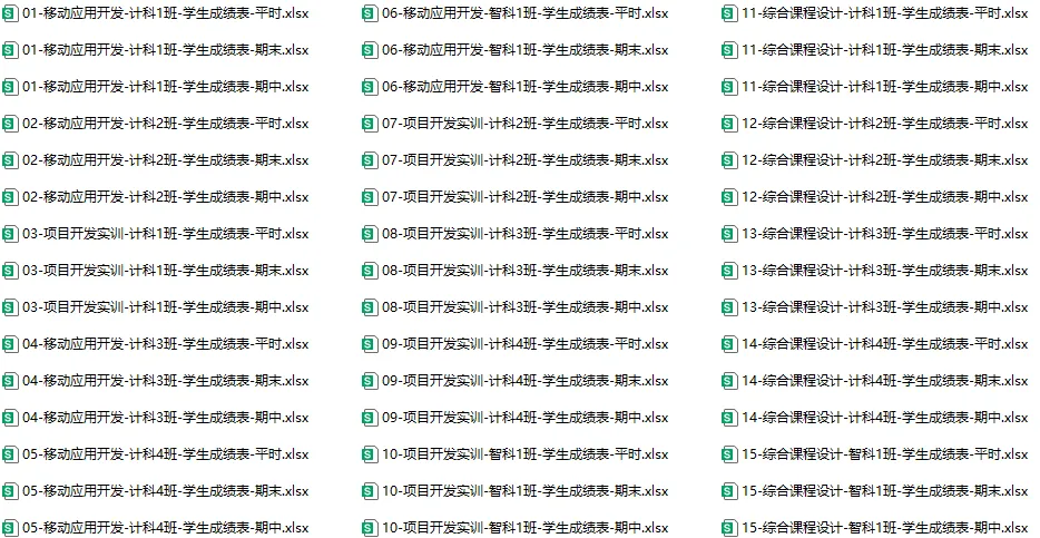 这学期我带了5个班、3门课,每门课有平时、期中、期末三张成绩表——共45个文件。