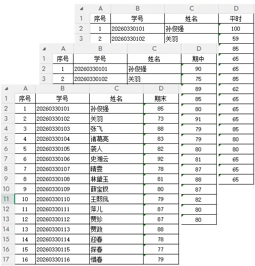 通过学号关联,将每个同学的三个成绩合并到一行,生成总评表。