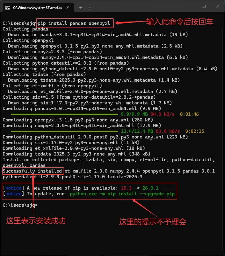 “Successfully installed”= 安装成功!如果最后出现了“A new release of pip is available”提示不用理会,不影响使用。