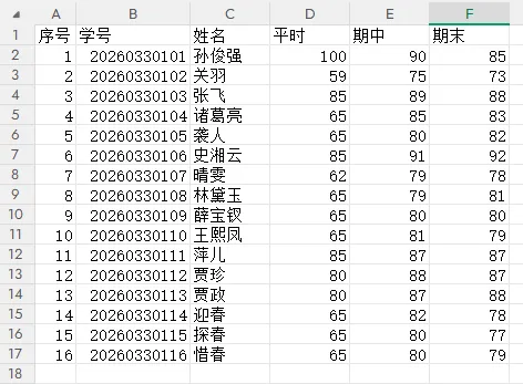 D:\PythonTest目录中获取所有Excel文件D:\PythonTestOut目录下import pandas as pdimport os# 指定合并文件的路径folder = r"D:\PythonTest"# 指定输出文件的路径folder_out = r"D:\PythonTestOut"# 检查输入文件夹是否存在if not os.path.exists(folder):print(f"❌ 文件夹不存在:{folder}") input("按回车退出")exit()# 创建输出文件夹(如果不存在)if not os.path.exists(folder_out): os.makedirs(folder_out)print(f"✅ 已创建输出文件夹:{folder_out}")def extract_group_key(filename):"""从文件名提取分组标识(课程+班级)""" parts = filename.split("-")if len(parts) >= 4:return"-".join(parts[:-1])return Nonedef extract_score_type(filename):"""从文件名提取成绩类型""" parts = filename.split("-")if len(parts) >= 1:return parts[-1].replace(".xlsx", "")return None# 1、从D:\PythonTest中获取所有Excel文件all_files = [f for f in os.listdir(folder) if f.endswith('.xlsx') and "总成绩" not in f]if not all_files:print("❌ 文件夹中没有Excel文件") input("按回车退出")exit()# 2.将所有文件按分类名(课程+班级)分组groups = {}for file in all_files: group_key = extract_group_key(file) score_type = extract_score_type(file)if group_key and score_type: groups.setdefault(group_key, {})[score_type] = fileelse:print(f"⚠️ 文件名格式不符:{file}")# 3.按分好的组合并文件for group_key, files_dict in groups.items():print(f"\n正在处理【{group_key}】...") required = {"平时", "期中", "期末"}if not required.issubset(files_dict.keys()):print(f" ❌ 缺少文件,跳过")continue df_dict = {}for score_type, file in files_dict.items(): try: df = pd.read_excel(os.path.join(folder, file)) score_col = df.columns[-1] df = df[["学号", "姓名", score_col]].copy() df.rename(columns={score_col: score_type}, inplace=True) df_dict[score_type] = dfprint(f" ✓ 已读取:{file},共{len(df)}人") except Exception as e:print(f" ✗ 读取失败:{file},错误:{e}")if len(df_dict) != 3:continue result = df_dict["平时"].merge(df_dict["期中"], on=["学号", "姓名"], how="outer") result = result.merge(df_dict["期末"], on=["学号", "姓名"], how="outer") result.fillna(0, inplace=True) result.insert(0, "序号", range(1, len(result) + 1)) output_path = os.path.join(folder_out, f"{group_key}-合并表.xlsx") result.to_excel(output_path, index=False)print(f" ✅ 完成!共{len(result)}人")# 4.看到"所有分组处理完成!"后,按回车退出程序。print("\n🎉 所有分组处理完成!")input("按回车退出")💡 提示:代码输入完成后,记得 保存哦。