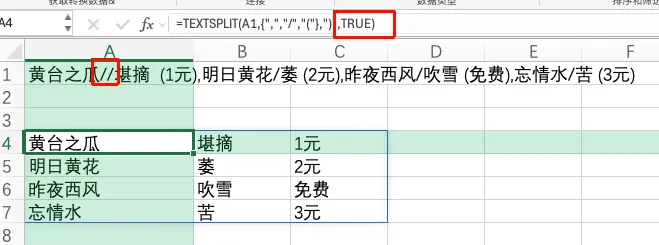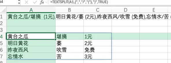 公式中的A1是函数的第1参数,指存储信息的单元格,也就是指定要拆分的文本。是函数的第2参数,是指将文本按什么指定的文本符号拆分到多列。因为示例中涉及多个分隔符号,因此,需要使用数组的形式提供分隔符号列表。意思是,当碰到",","/","("符号时,将其分列。效果如下,这是只分列的结果。所有的拆分结果都在同一行内这是函数第3参数,意思是在分列的同时,还要按")"符号同时分行。在第2参数分列的结果上,如果遇到")"符号,直接换到下一行。在本例中,由于一个物品的信息是以"元"为结尾,而每个"元"的后面都有")",因此,到了"元"这里,会将后面的内容拆分到新的一行中。"true"是函数的第4参数,这里是指定是否要忽略连续分隔符。默认是False,不忽略。如果不忽略,遇到重复的分隔字符,则会插入一个空白单元格,这对保持数据对齐很有用处。而将第4参数设置为true后,同样的文本,效果完全不一样。原本乱糟糟的一团,瞬间就变成了一个2行3列的标准表格。虽然说,日常中很少碰到这样极端的数据。但是这个示例可以很好的说明textsplit的使用方法。