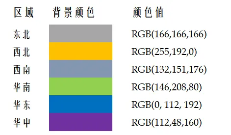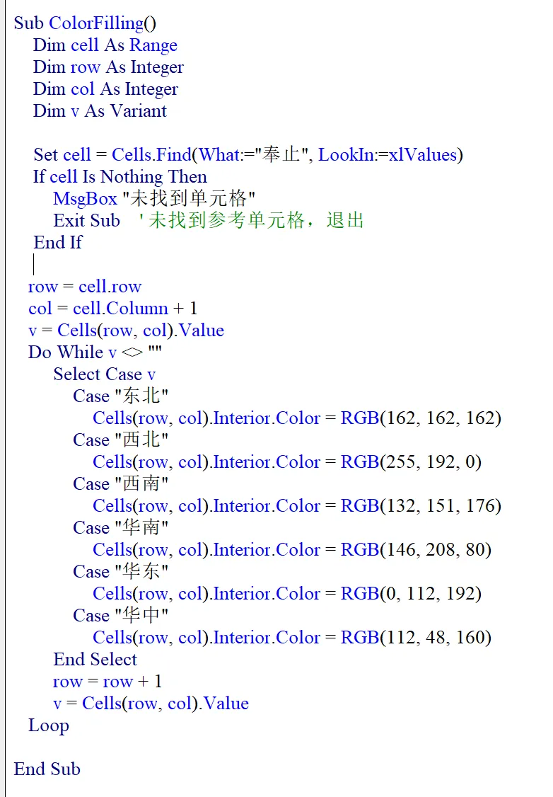 找到值为“奉止”的单元格(cell)之后,cell.Row 就是该单元格所在的行,cell.Column 即为该单元格的列。有了第一个数据单元格的行与列,我们就可以遍历这个销售报表,根据图例来填色了。Dim rowAsIntegerDim col AsIntegerrow= cell.Rowcol = cell.Column +1Do While Cells(row, col).Value<> ""SelectCase Cells(row, col).ValueCase "东北" cell.Interior.Color = RGB(166, 166, 166)Case "西北" ...EndSelectrow=row+1Loop