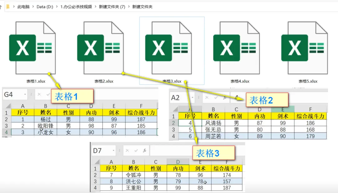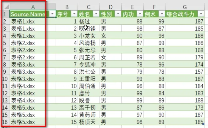 之前有一期视频给大家讲解了如何将多个excel表格合并汇总为一个excel表格,很多网友留言,希望我写一期文章,能够方便大家按步骤操作,今天我们就写这样的一篇文章,大家可以按文章所列步骤一步步操作。 如下图,为了方便演示,我们列举5个表格,每个表格中有三行数据。第1步:新建文件夹,并将这5个excel表拖入新建文件夹中,如下图第3步:新建excel表,并从文件夹获取数据源,如下图第4步:粘贴文件源地址,转到文件组合对话框,如下图 通过以上5个步骤,我们就可以完成对多个表格进行数据合并,如下图,大家可以看到,新建的excel表已经将我们列举的5个excel表中的数据合并在了一起,并且这些数据是动态的,也就是说被合并的5个excel表中有任何一个表中的数据修改、增加、删除等操作,合并的数据总表内容会相应的发生变化。 如下图,当修改其中一个excel表时,数据总表的数据也会相应更新。我们在表1增加了一行数据,点击总表右键刷新,数据就会更新进总表。 以上就是利用 Excel 自带的数据获取功能,批量合并多个表格的完整步骤。不用写代码、不用复制粘贴,只要按这 5 步操作,再多表格也能一键汇总,而且数据还能实时联动刷新,后续修改原始表格也不用重新合并,效率直接拉满。