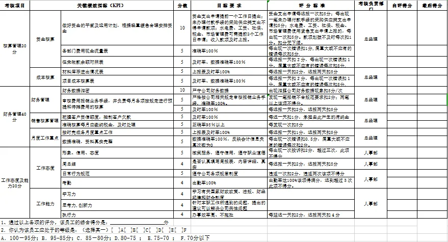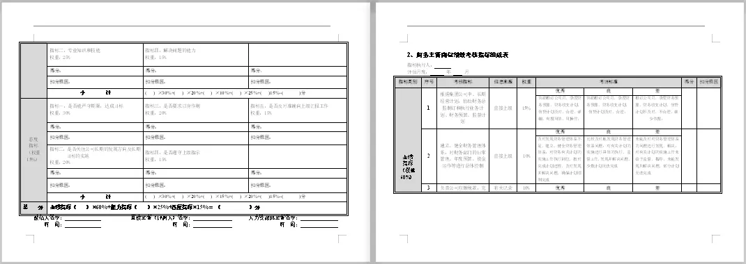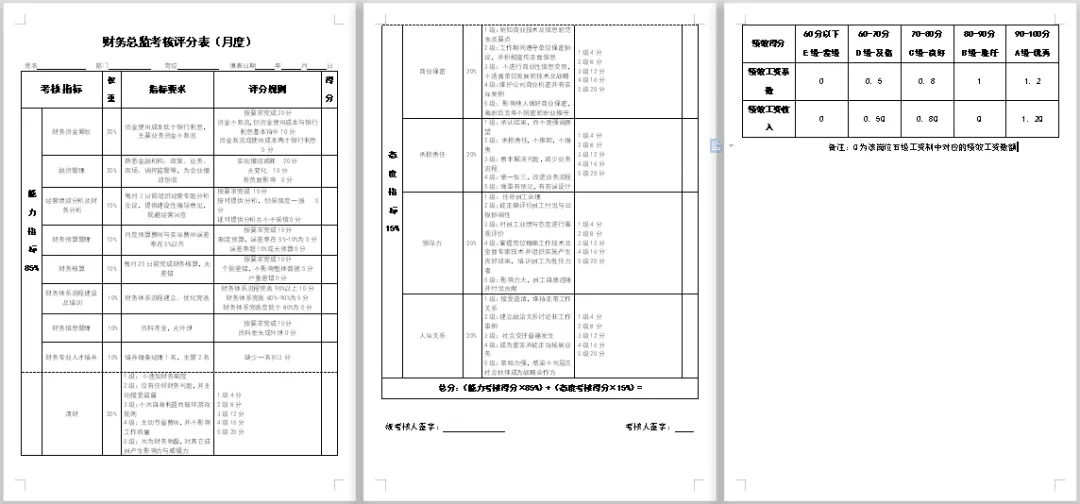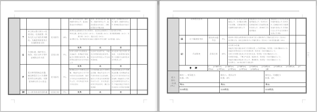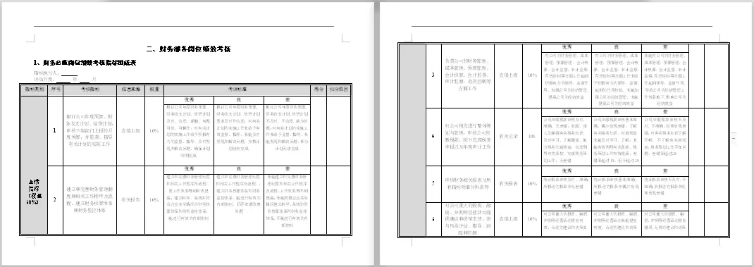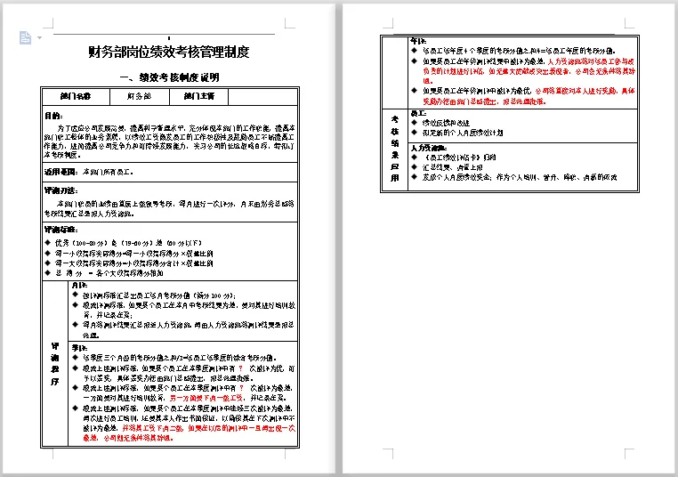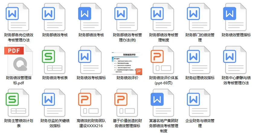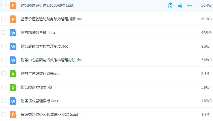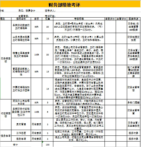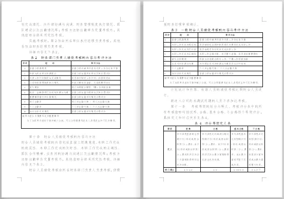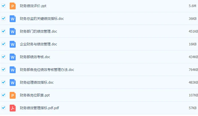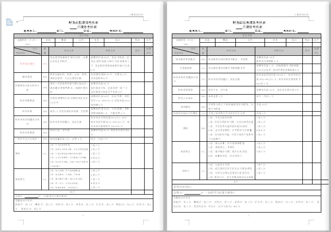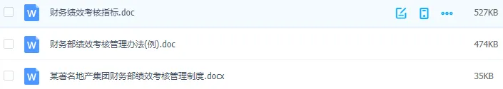 包含财务各个岗位。本套资料还包含财务各岗位绩效考核管理办法、财务部绩效考核、财务部绩效考核管理办法、财务部绩效考核管理制度、财务绩效管理指标、财务绩效评价体系、财务中心薪酬与绩效考核管理办法、财务总监绩效考核表、财务经理绩效指标、财务主管绩效计划表、中小企业财务部绩效考核表、某著名地产集团财务部绩效考核管理制度等,预览如下:
