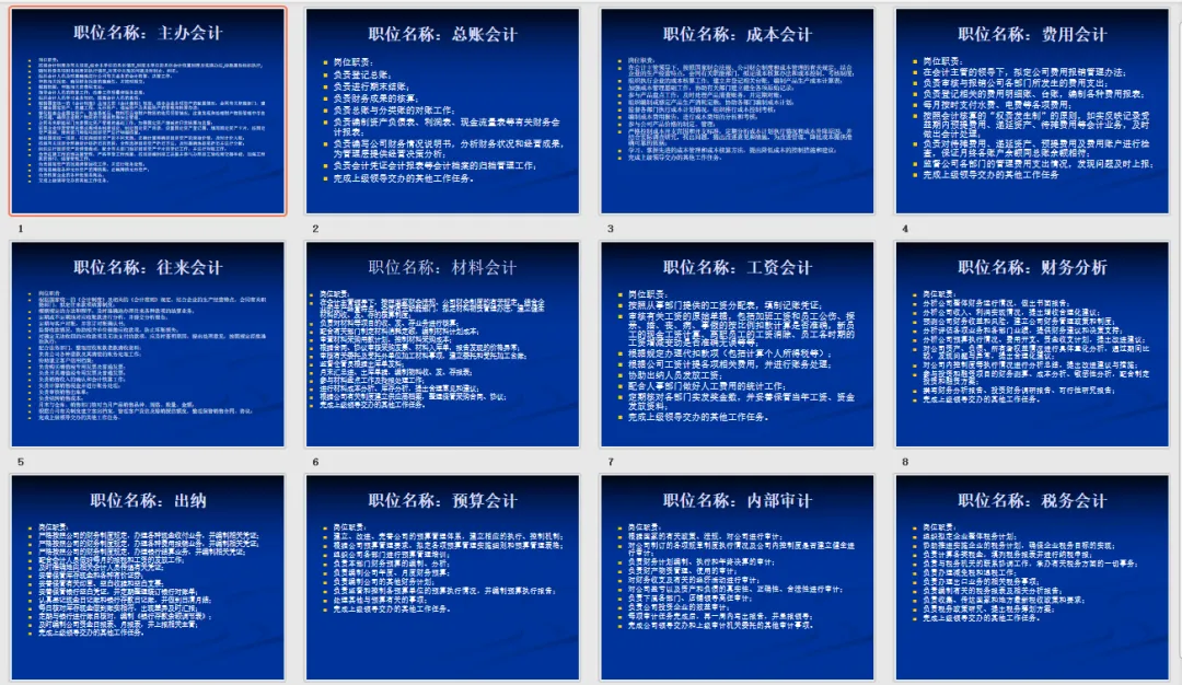 每一位财务人,都需要确定财务部的工作内容都有哪些,知道了需要干什么,再去设置岗位,然后根据岗位分配相应的职责,之后在根据具体的执行情况进行相应的调整,并能够定期的回顾工作,与统计工作量相结合,这是制定财务部岗位职责的大逻辑。