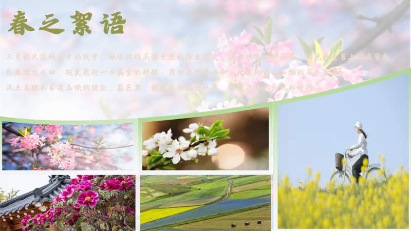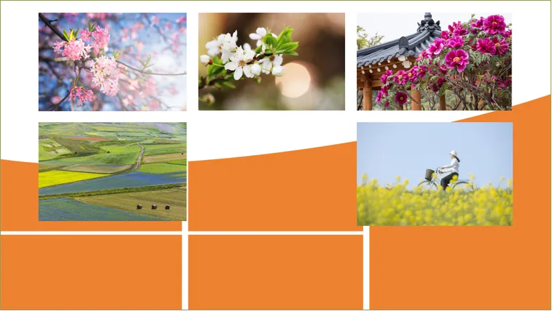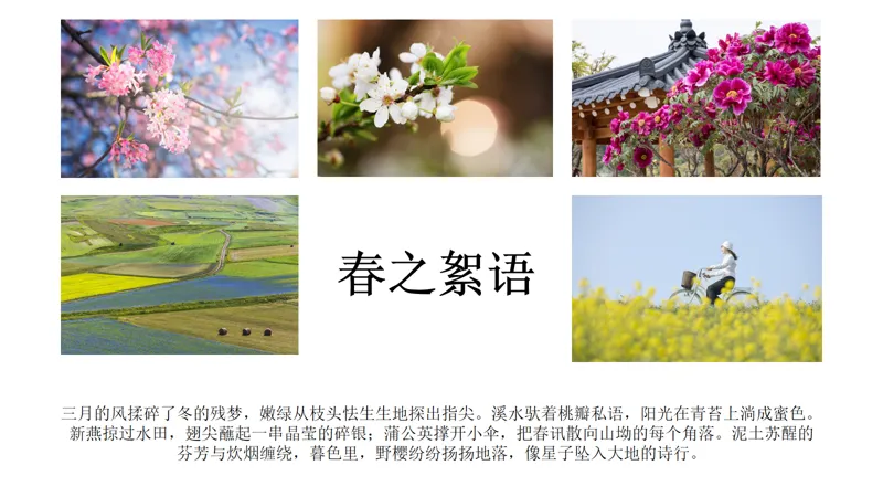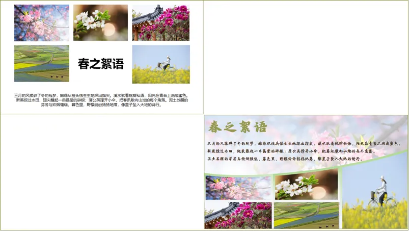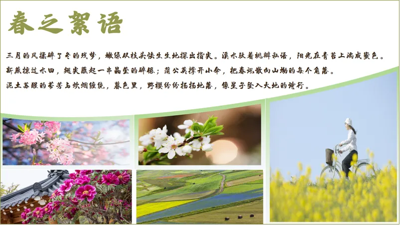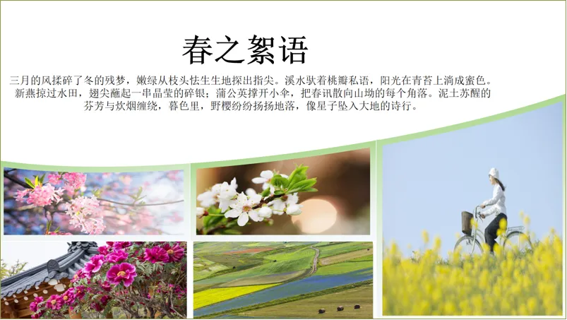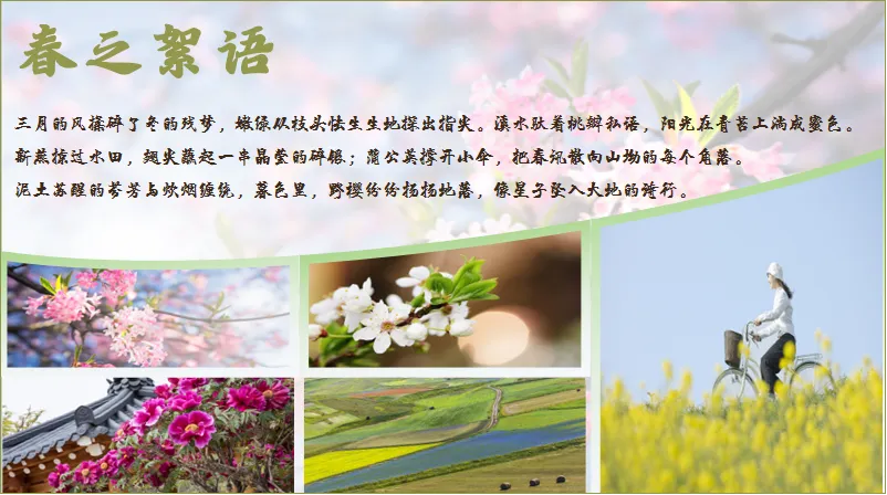 大家好,我是糙汉,一个自学PPT的国企小白!因为工作需要,我经常做PPT材料,但在制作的过程中发现自己的制作能力和水平还有欠缺,所以,我就利用业余时间自学PPT制作。每次发布的PPT制作教程,都是我在网上学习到的技巧、思路应用到实际工作中的成品。这不马上要放#春假 了吗!我老婆作为小学老师,需要做一份关于宣传春天的PPT,她要把几张图片和文案进行排版。一开始她只是简单地进行了排版。但是,她觉得没有特点,排版也是平淡无奇!于是找我出主意,看能不能给改进一下。我就想到借用形状插入图片的思路进行重新排版设计,搞好后我让我老婆看是否满意!下面,我把这个PPT图文排版的设计步骤告诉给大家!在PPT页面中插入一个梯形,将梯形放大并放在PPT页面底部。全选形状,在【合并形状】中选择【拆分】,删除多余的形状。再插入若干个长矩形,全选形状,同样在【合并形状】中选择【拆分】,删除多余的形状。依次对形状进行图片填充。填充方式:选中图片进行剪切(或Ctrl+X),点击右侧【填充】-【图片或纹理填充】-【图片填充】-下拉选择【剪切板】。再适当调整形状大小。将文字信息复制到PPT页面中,调整字体、颜色、大小和位置。如果你觉得背景比较单调,还可以把PPT添加上背景图片,调整透明度。是不是很简单!