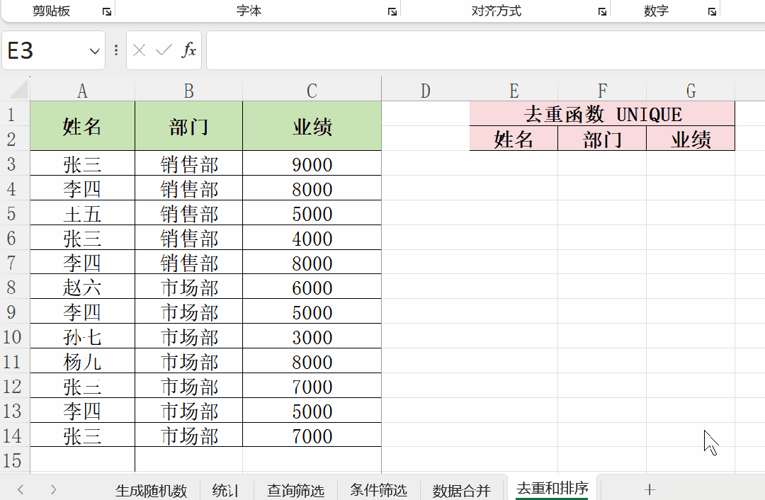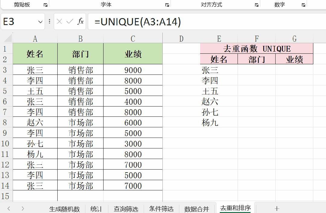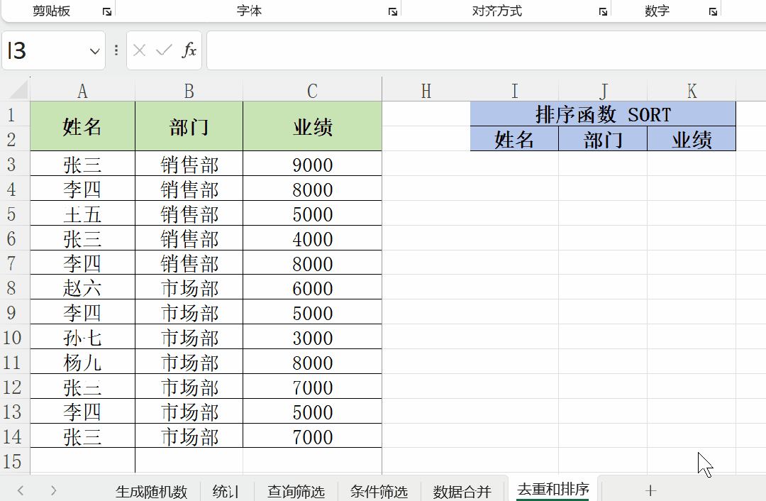 1.单条件去重,如下图,我们按姓名列去重,可以得到唯一的一列姓名2.双条件去重,如下图,我们按姓名列和部门列去重,只有姓名和部门均相同的数据被剔除,姓名相同但是部门不同的数据会留下3.三条件去重,如下图,我们按姓名、部门和业绩列去重,只有姓名、部门和业绩列均相同的数据被剔除,三个条件中有一个不相同的数据会留下二、排序函数SORT的应用