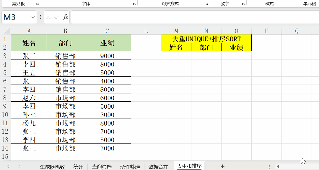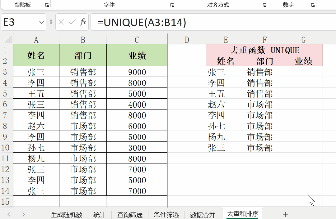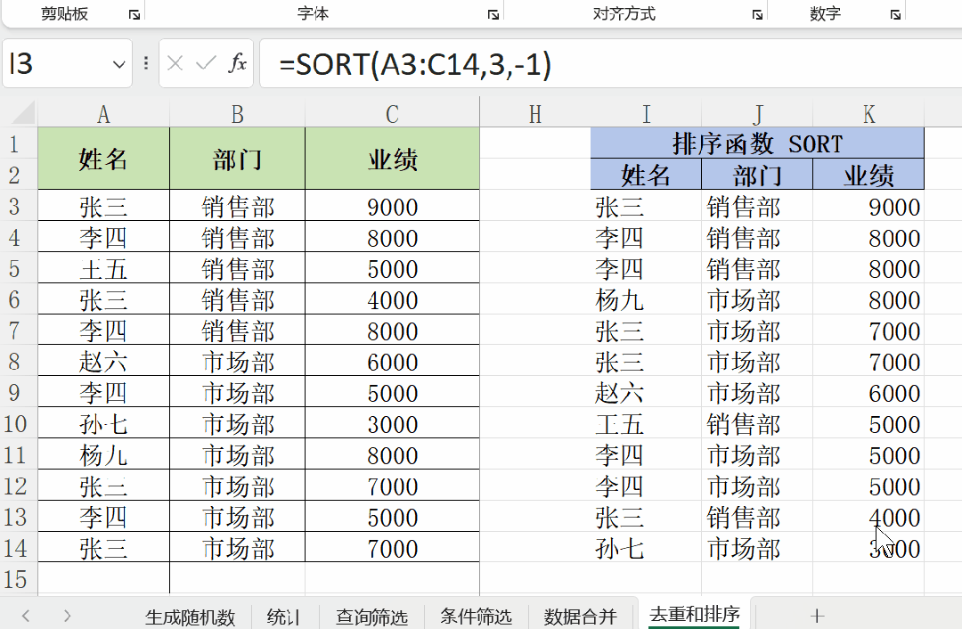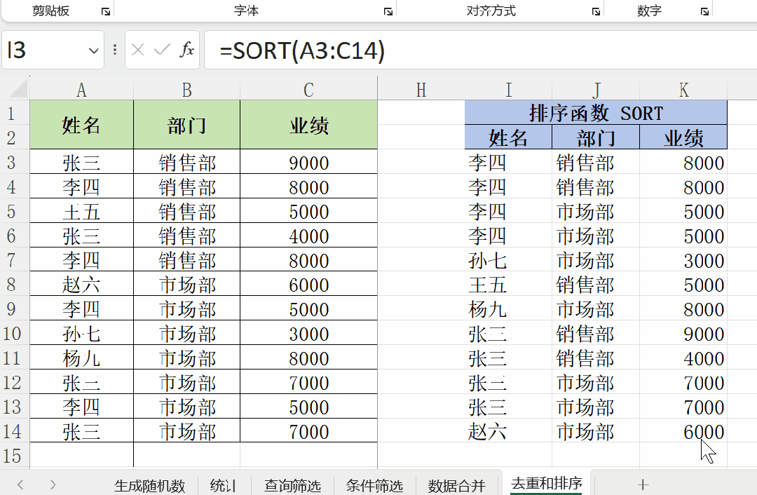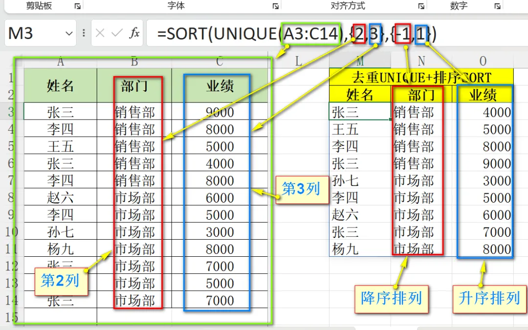 如下图,我们输入函数公式=SORT(UNIQUE(A3:C14),{2,3},{-1,1}) ,即对姓名、部门和业绩三列数据先去重,然后再分别按部门列降序排列,然后再按业绩列升序排列 本篇文章中的公式大家可以直接粘贴使用,文末有该excel文件的下载链接,大家可以下载学习,该excel文件里面集成了咱们近期讲过的数据随机生成、数据统计、数据查询、条件筛选、合并、去重和排序等公式内容。四、总结