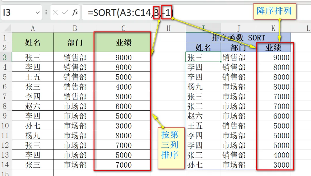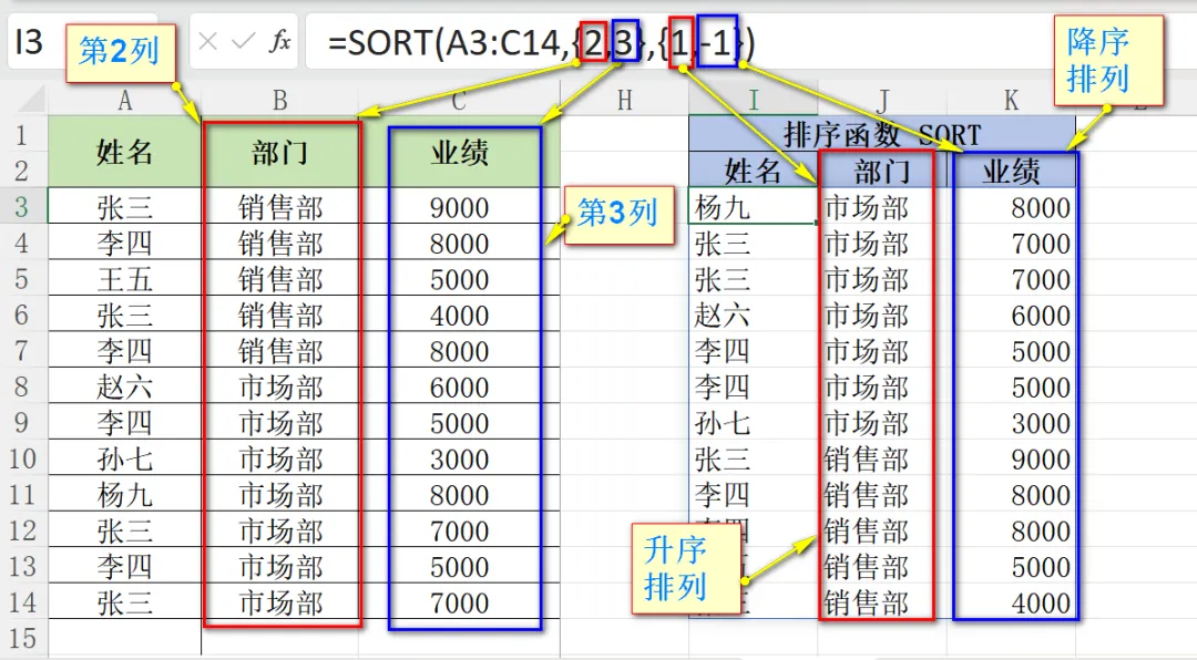 SORT的函数基本应用=SORT(数组, [排序依据], [排序顺序], [按列/行]),第一个参数:数组指的是我们需要排序的数据区域;第二个参数:排序依据,指的是我们按第几列进行排序,如果按第一列,我们就输入1,第二列就输入2;第三个参数:排序顺序,1为升序,-1为降序;第四个参数:FALSE表示按行排序(默认),TRUE表示按列排序。1.按第一列排序,如下图,当我们选取排序区域后,该函数会默认按第一列数据进行排序,即按姓名列排序2.按第二、三列排序,如下图,我们可以看到,我们可以按第二列,部门进行排序,也可以按第三列,业绩进行排序,我们可以升序(1)排列,也可以降序(-1)排列。3.多条件排列,如下图,当我们需要对数据区域先进行第2列(部门)排序,再进行第3列(业绩)排序时,我们可以按下图输入公式函数=SORT(A3:C14,{2,3},{1,-1}),其中{2,3}代表第2列和第3列,{1,-1}分别代表第2列升序,第3列降序。三、去重UNIQUE+排序SORT函数应用