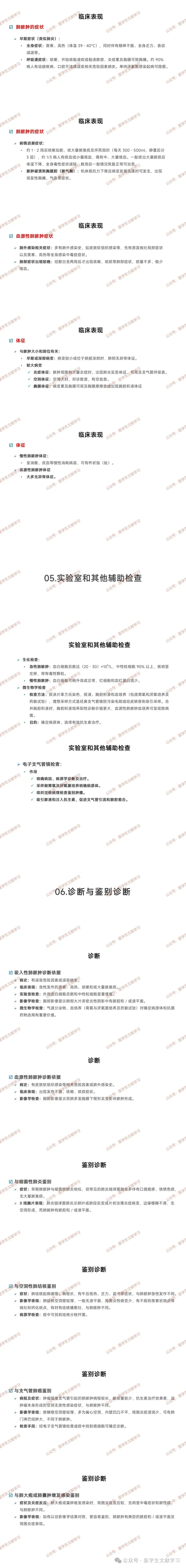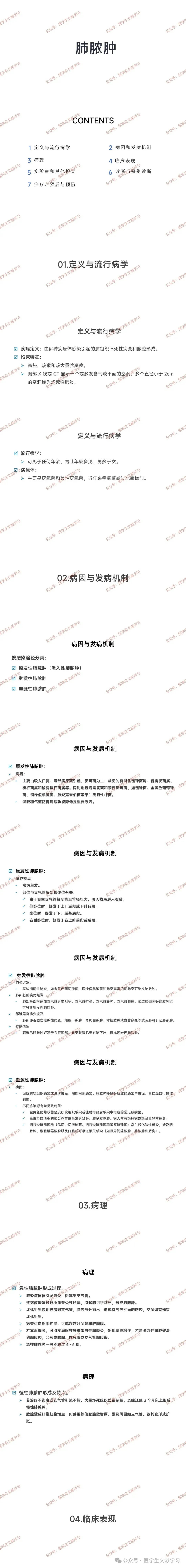 1.定义:由多种病原体感染引起的肺组织坏死性病变和脓腔形成,临床特征为高热、咳嗽和咳大量脓臭痰,胸部 X 线或 CT 显示含气液平面的空洞。