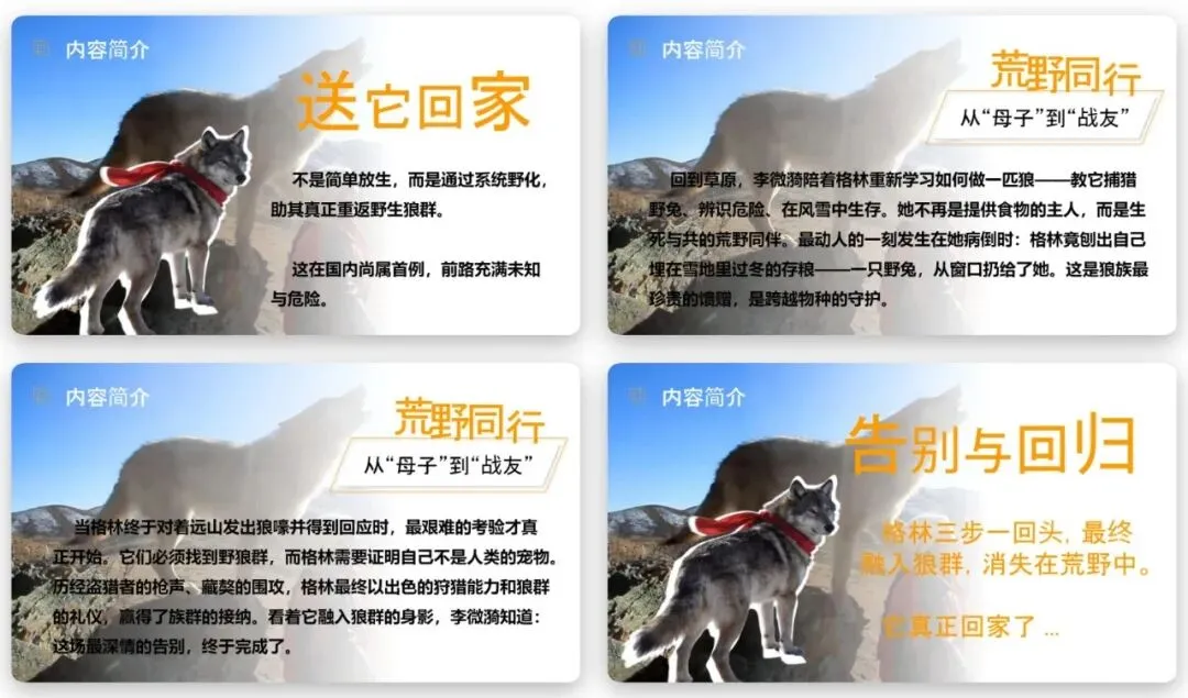 于是,她选择了一条最难走的路,放下安稳的生活,带着格林回到草原,教它生存的本领,忍着满心的不舍,亲手把它送回狼群,送回属于它的世界。