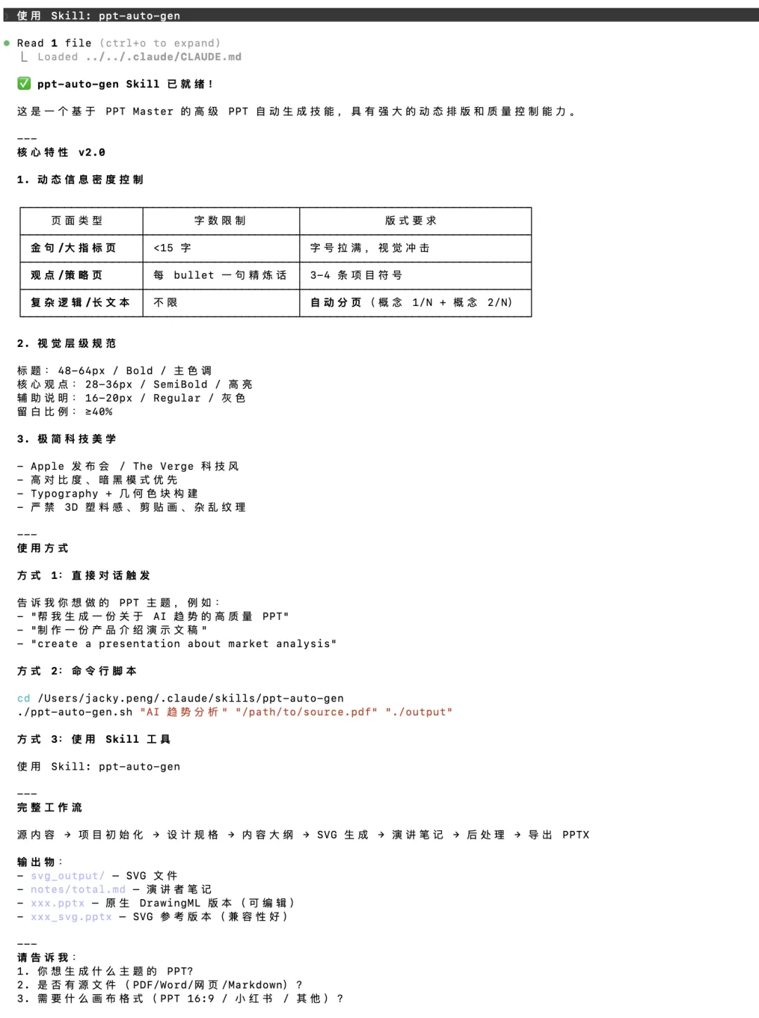 使用 Skill: ppt-auto-genClaude Code 会自动加载 Skill 并显示说明: