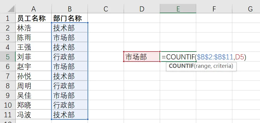 我们便在E5单元格中,使用了countif公式写法如上图,当然上图的红色D5也可以用“市场部”这个来表示