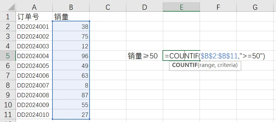 场景:下面的订单表,统计“销量≥50”的订单有多少个