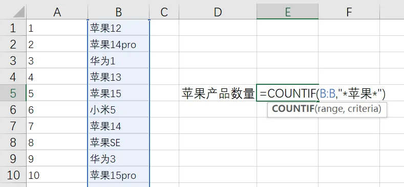 场景:有一份产品表,想统计“包含苹果”的产品有多少个(比如“苹果13”“苹果15”)