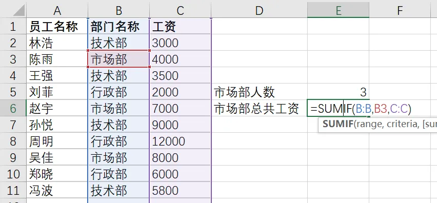 ✅ 解读:在B列(表示方式为B:B)中查找为市场部(表示方式为B3),将C列(C:C)的工资统计汇总加起来;