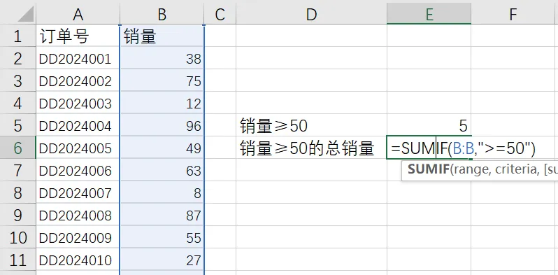 ⚠️ 注意:如果求和区域和条件区域是同一列(比如本案例),公式可以简化为:=SUMIF(B:B, "≥50"),否则需按=SUMIF(B:B,"≥50",B:B)或者=SUMIF(B:B,"≥50",C:C)等等,第二个B:B或C:C是根据需要求和的区域来定。