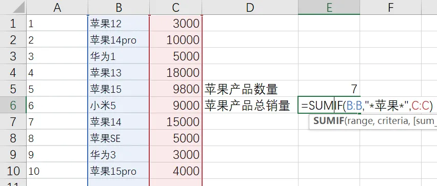 ✅ 解读:和COUNTIF的通配符用法一样,* 代表任意字符,轻松统计所有含“苹果”的产品销售额。