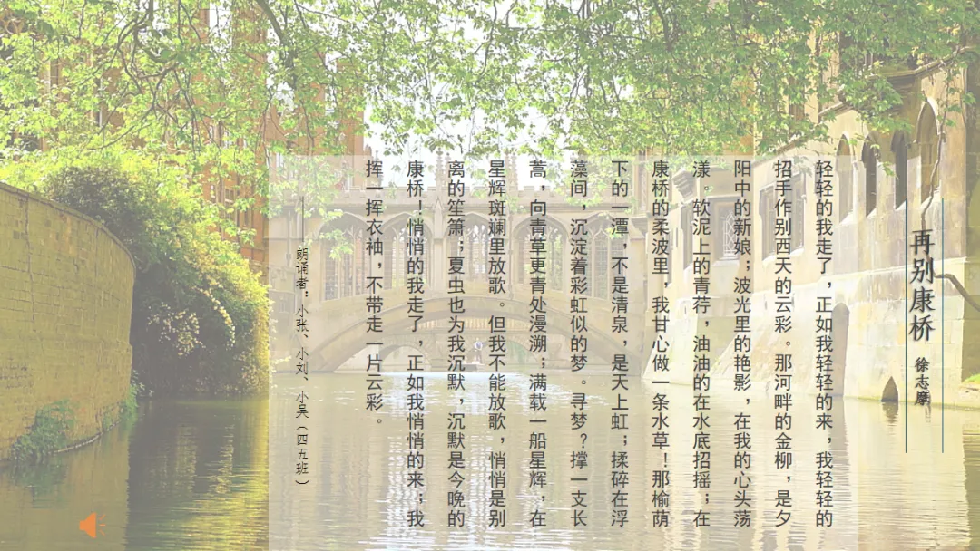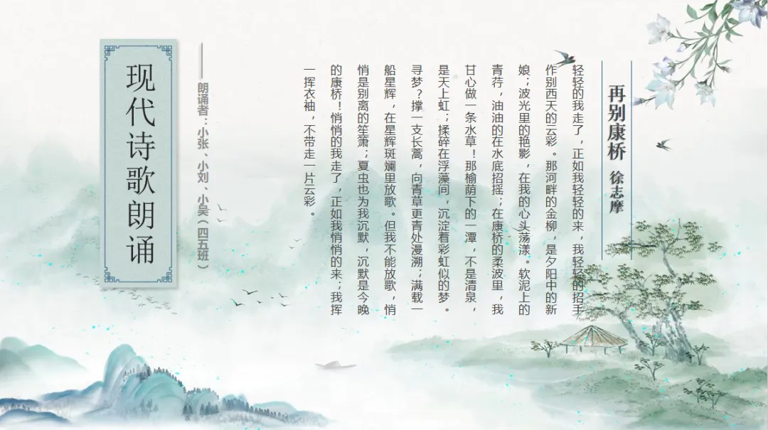 我拿去给孩子爸爸看,他却说朗诵主题《再别康桥》,中国风的PPT不太搭,也缺少康桥的元素。