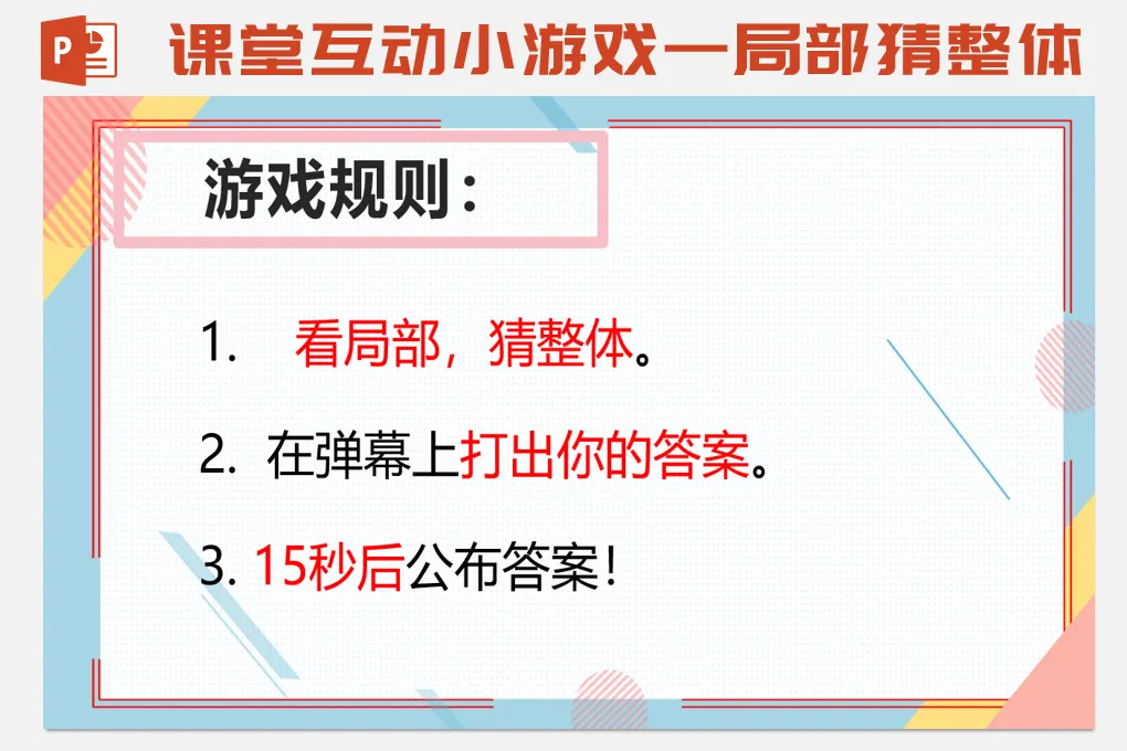 课堂互动如何打破沉闷?今天为大家推荐一款高效又有趣的课堂互动小游戏 PPT——局部猜整体,适配各类学科课堂,轻松提升学生参与度。