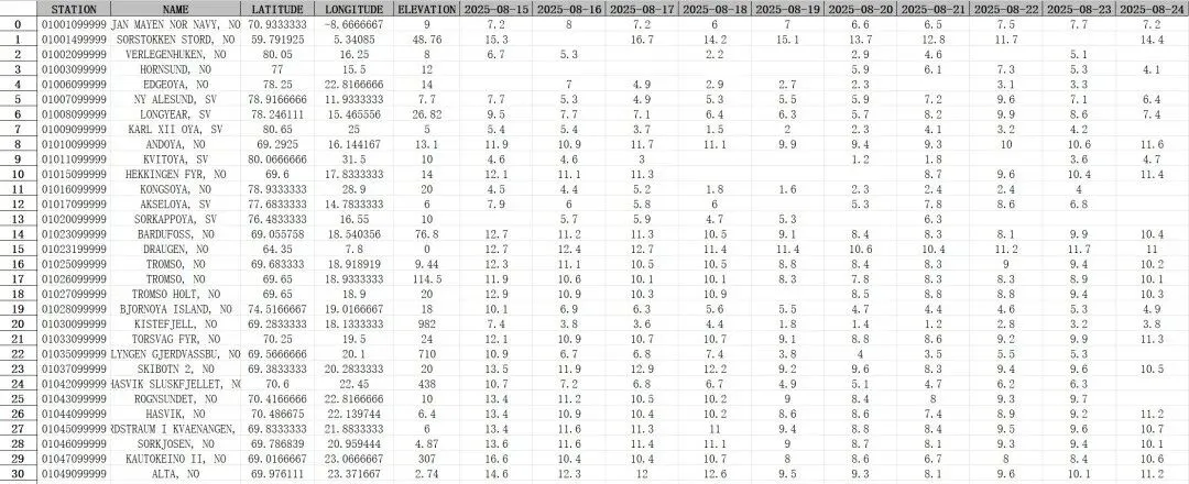 数据字段包括气象观测站点的编号(STATION)、气象观测站点的名称(NAME)、纬度(LATITUDE)和经度(LONGITUDE)以及每日平均气温数值(例如2025-01-01)。我们来预览一下: