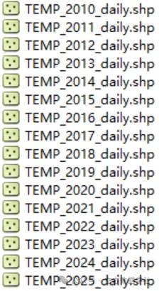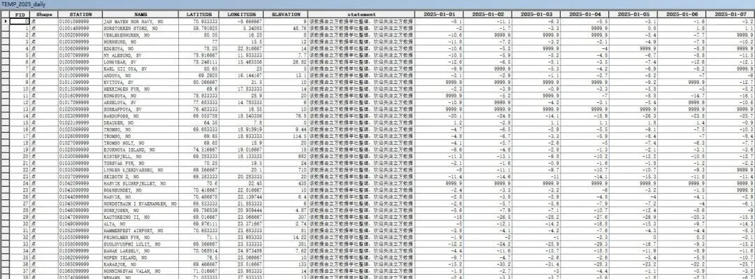 Shp格式数据的具体属性和Excel数据相同,我们以2025年气象观测站点的每日平均气温数据为例来预览一下: