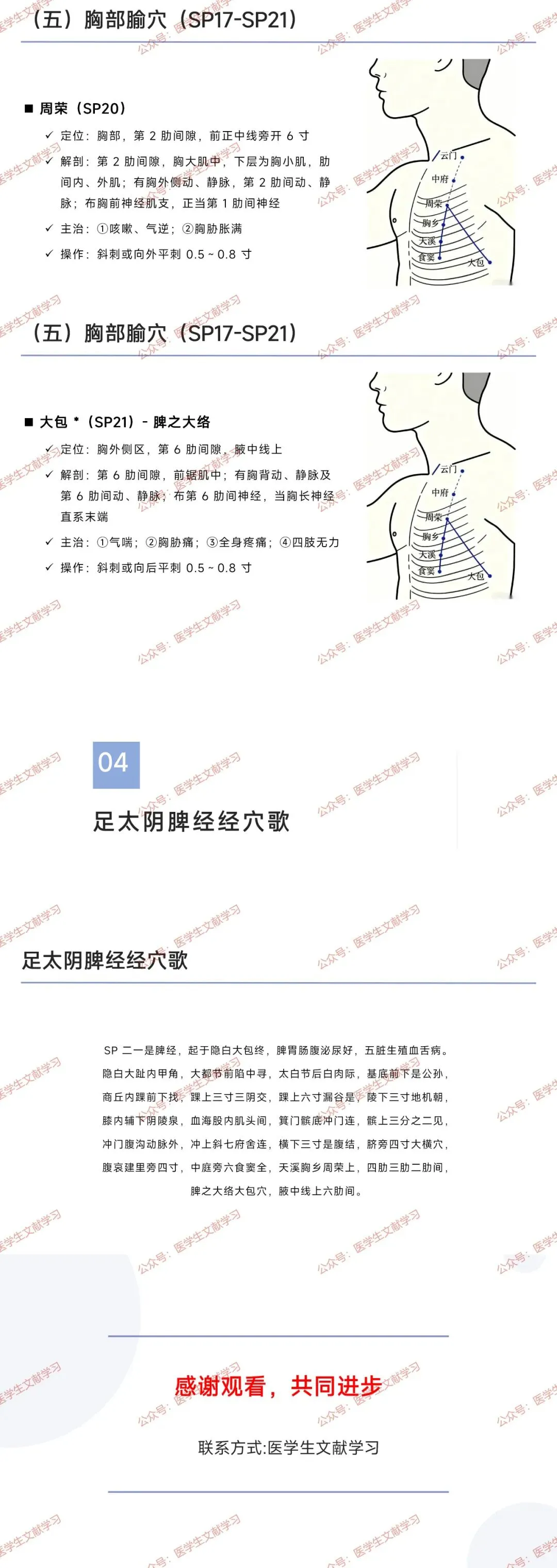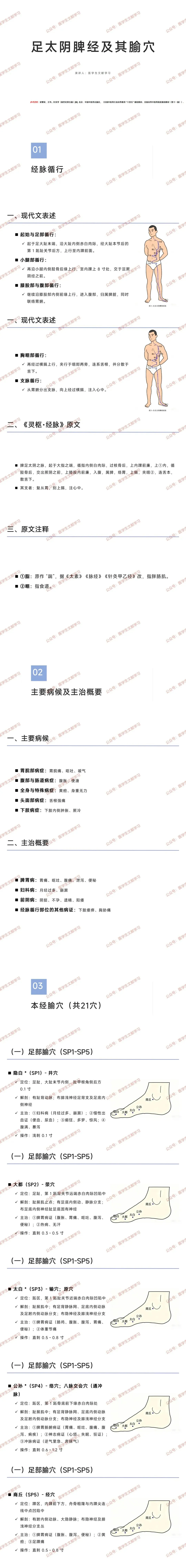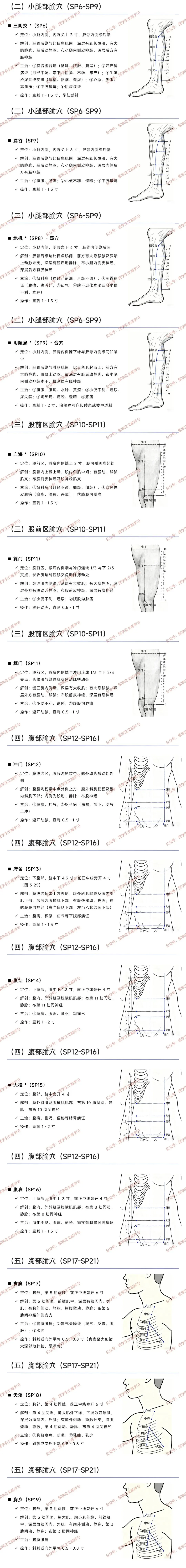 SP 二一是脾经,起于隐白大包终,脾胃肠腹泌尿好,五脏生殖血舌病。隐白大趾内甲角,大都节前陷中寻,太白节后白肉际,基底前下是公孙,商丘内踝前下找,踝上三寸三阴交,踝上六寸漏谷是,陵下三寸地机朝,膝内辅下阴陵泉,血海股内肌头间,箕门髌底冲门连,髌上三分之二见,冲门腹沟动脉外,冲上斜七府舍连,横下三寸是腹结,脐旁四寸大横穴,腹哀建里旁四寸,中庭旁六食窦全,天溪胸乡周荣上,四肋三肋二肋间,脾之大络大包穴,腋中线上六肋间。