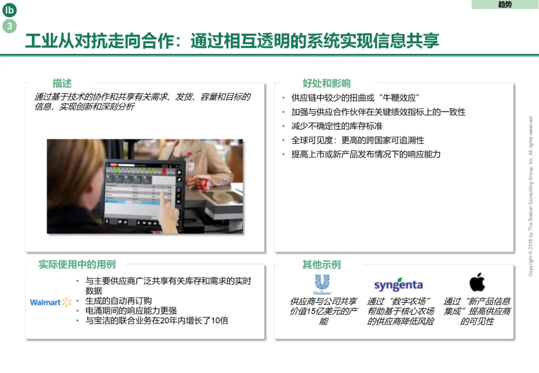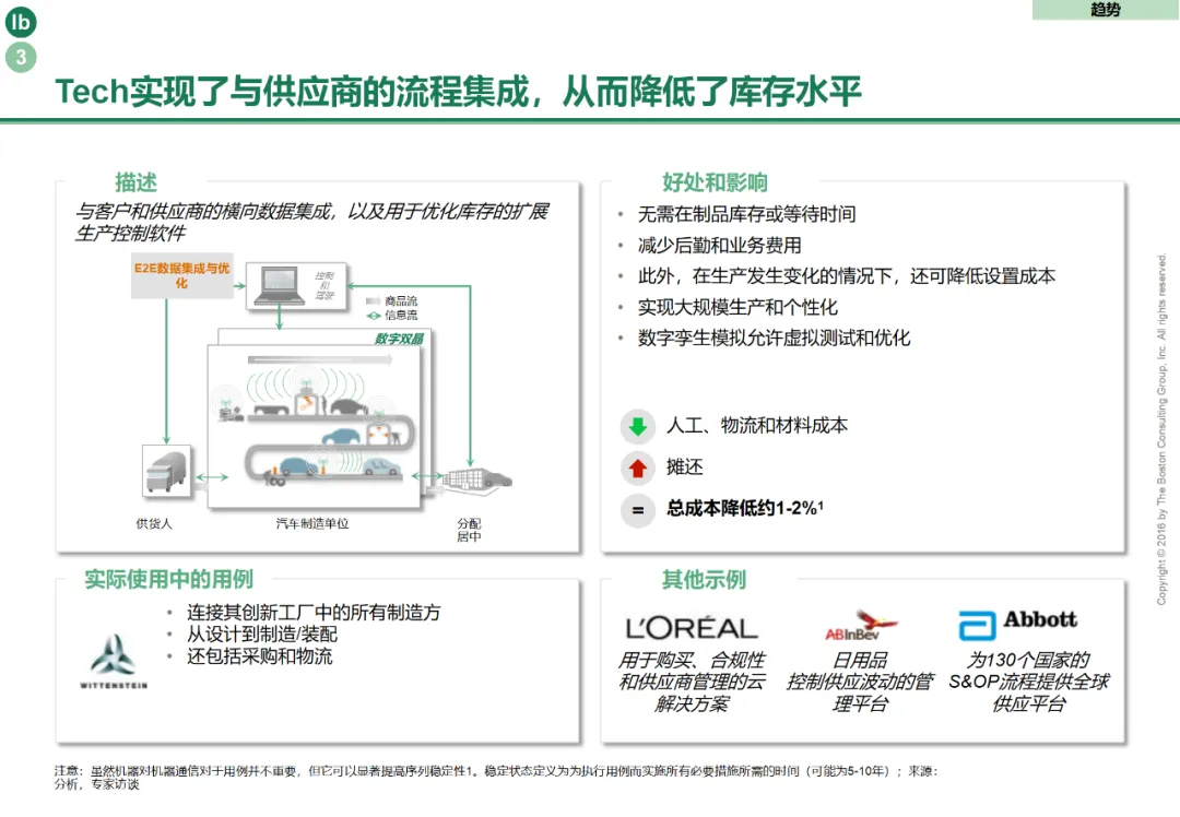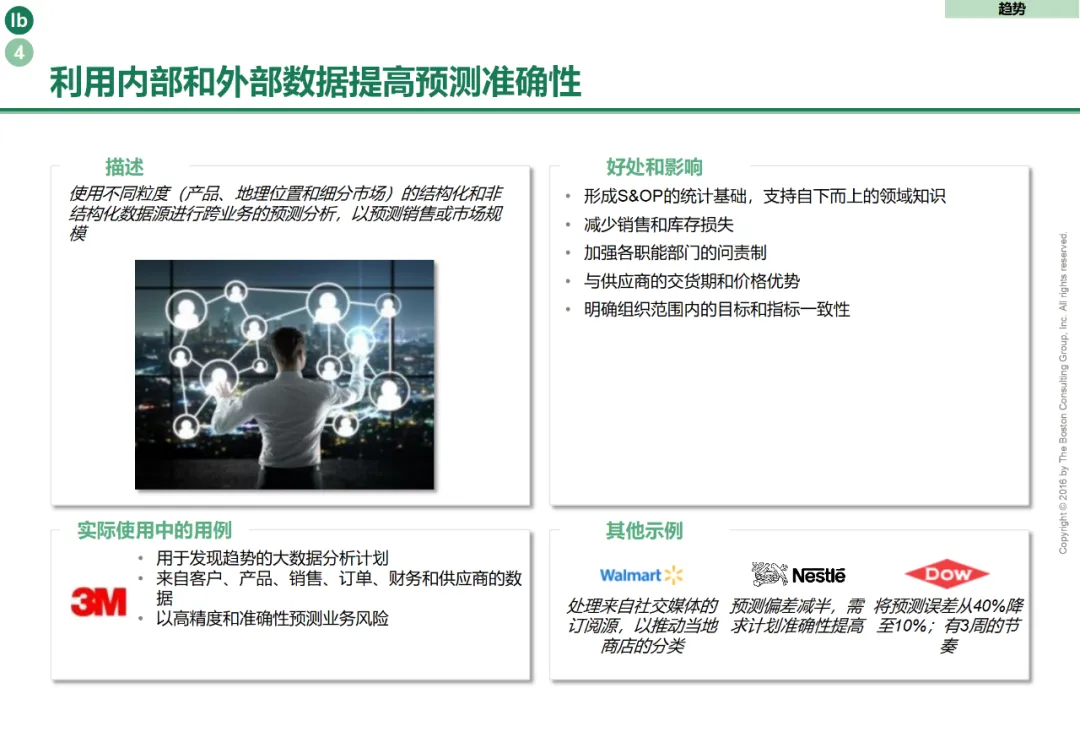 传统S&OP (销售与运营规划) 流程往往因数据割裂、周期冗长、部门本位主义而沦为形式,无法有效平衡供需与驱动执行。BCG倡导将其进化为一个由智能技术赋能、跨部门深度协同的集成业务规划(IBP)中枢,成为连接战略规划与日常运营、驱动端到端供应链集成的关键引擎。其进化路径聚焦三大核心:数据驱动的实时化与一体化,打破部门数据壁垒,集成销售预测、市场情报、生产实绩、库存状态、供应商交付、物流在途等多源实时数据,构建统一的供应链“数字孪生”视图,为协同决策提供唯一事实来源。