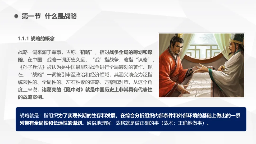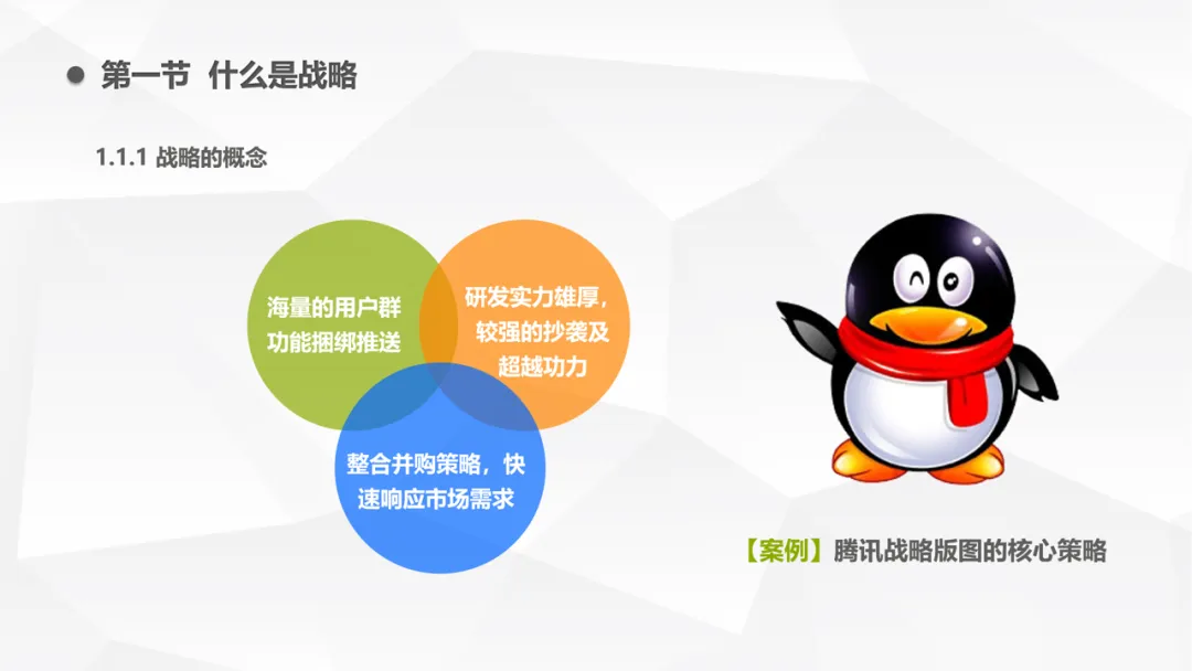 战略的概念与特征:战略源于军事 “韬略”,现指组织为长期生存发展,基于内外部环境分析制定的全局性、长远性谋划,核心是 “做正确的事”(区别于战术 “正确地做事”)。其具有全局性、长远性、纲领性、客观性、竞争性、风险性六大特征,腾讯通过整合并购、功能捆绑等策略构建战略版图,是典型实践案例。
