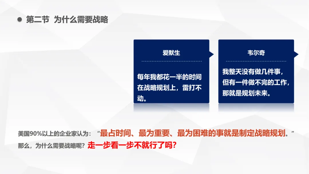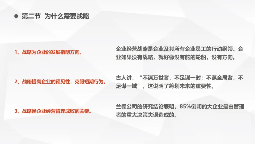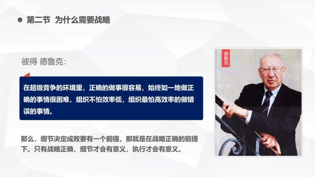 战略的核心价值:一是为企业发展指明方向,避免盲目经营;二是提高预见性,克服短期行为,减少决策失误;三是决定经营管理成败,只有战略正确,细节与执行才有意义,正如德鲁克所言,超级竞争环境中 “做正确的事” 比 “正确地做事” 更重要。