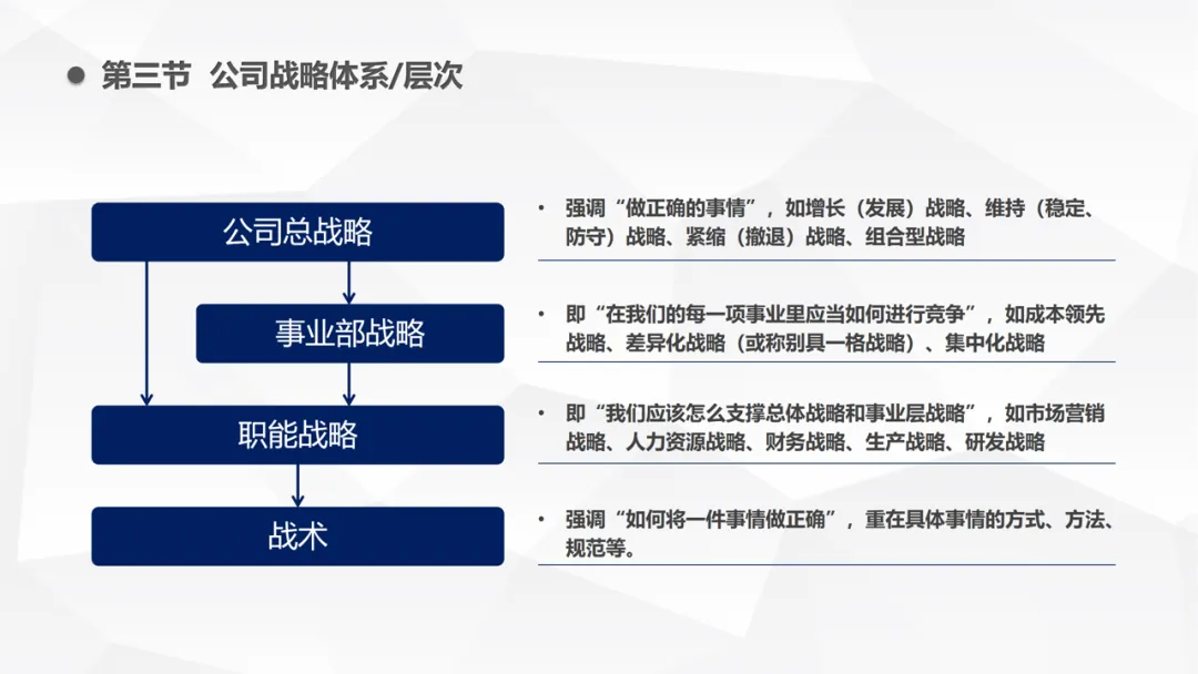 战略体系层次:分为公司总战略(增长、稳定、紧缩、组合型战略)、事业部战略(成本领先、差异化、集中化战略)、职能战略(营销、人力、财务等支撑战略)与战术四个层级,层层递进支撑企业目标实现。
